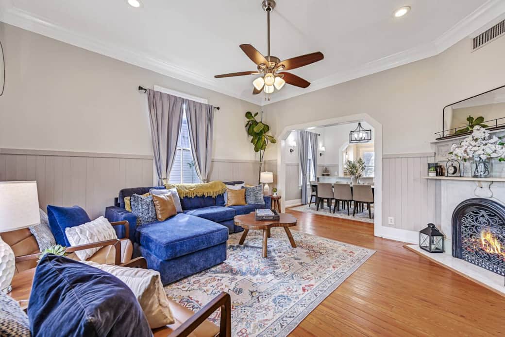 View of spacious main living room, fireplace, luxurious, comfortable seating for all guests. Amazing original windows w/blackout curtains surround. Original hardwoods and open concept continue to large dining room and kitchen.